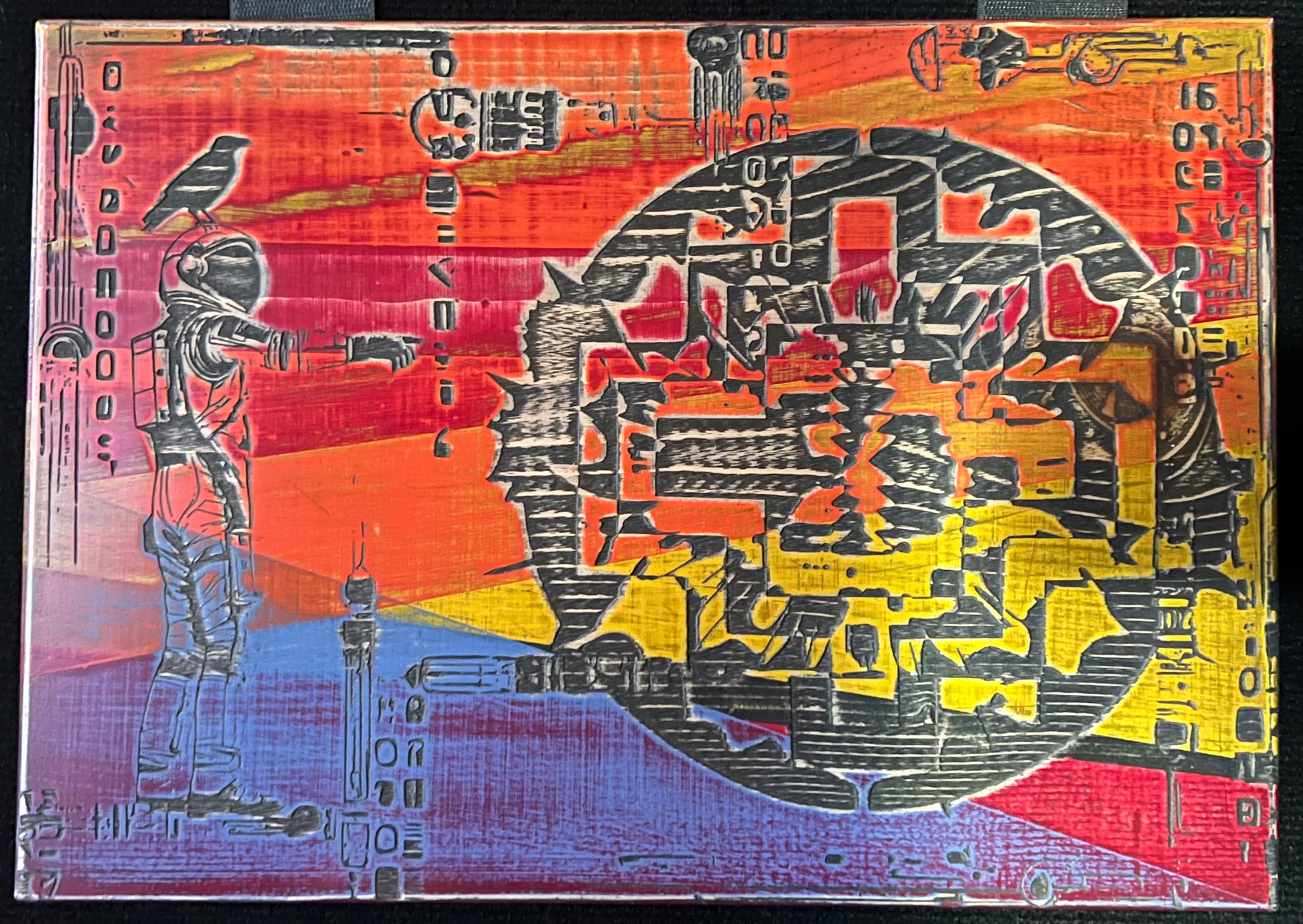 Original artwork consisting of abstracted characters collaged on wood, painted, sanded, etched, stained, and sanded to 2000 grit. Work is created on 3/4" board and is meant to be displayed unframed. It can hang from the installed saw hook or leaned. Titled and signed on back by hand. Piece is 16” wide by 11.25” tall.
