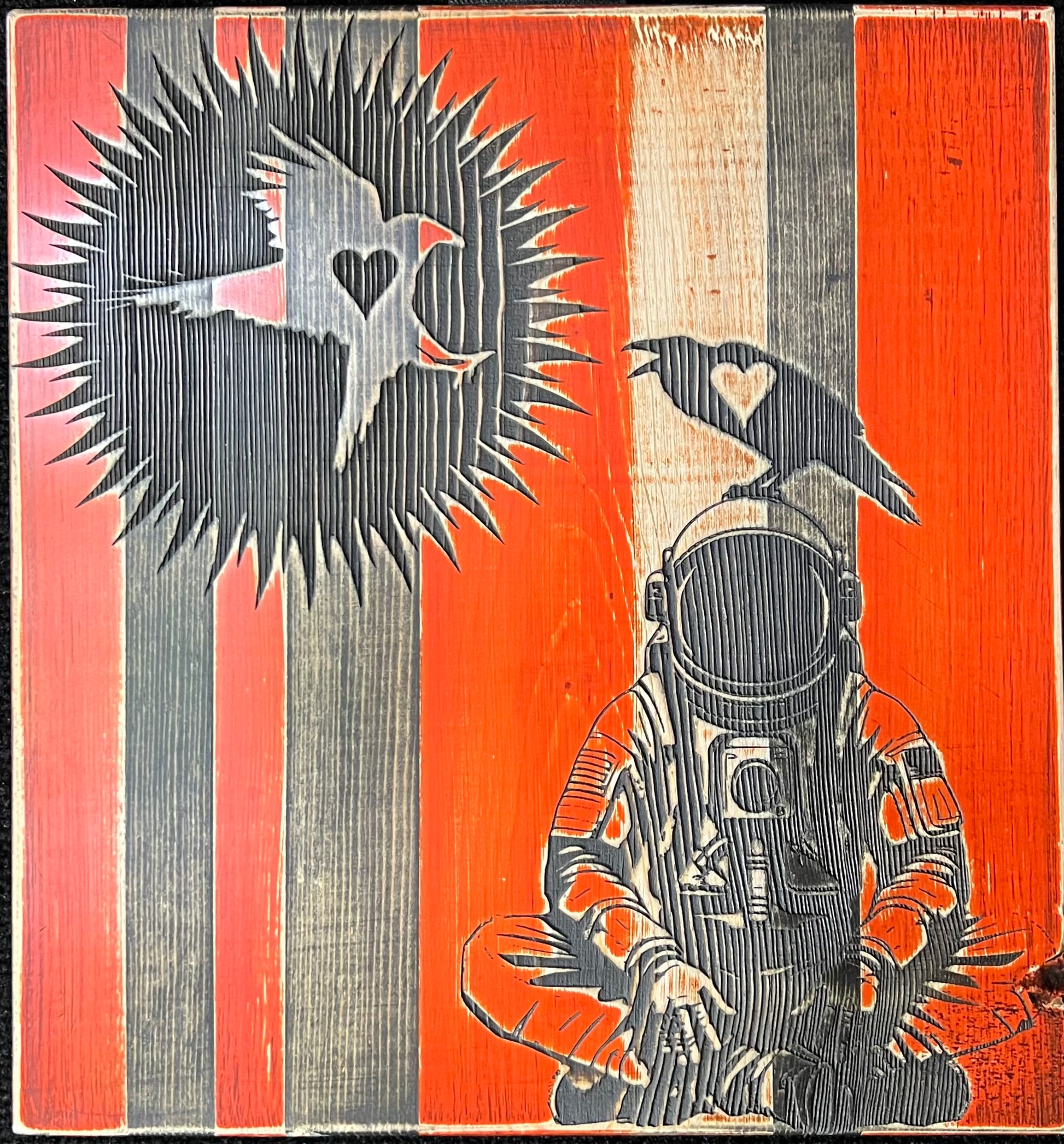 Original artwork consisting of abstracted characters collaged on wood, painted, sanded, etched, stained, and sanded to 2000 grit. Work is created on 3/4" board and is meant to be displayed unframed. It can hang from the installed saw hook or leaned. Titled and signed on back by hand. Piece is 11.25” wide by 12” tall.