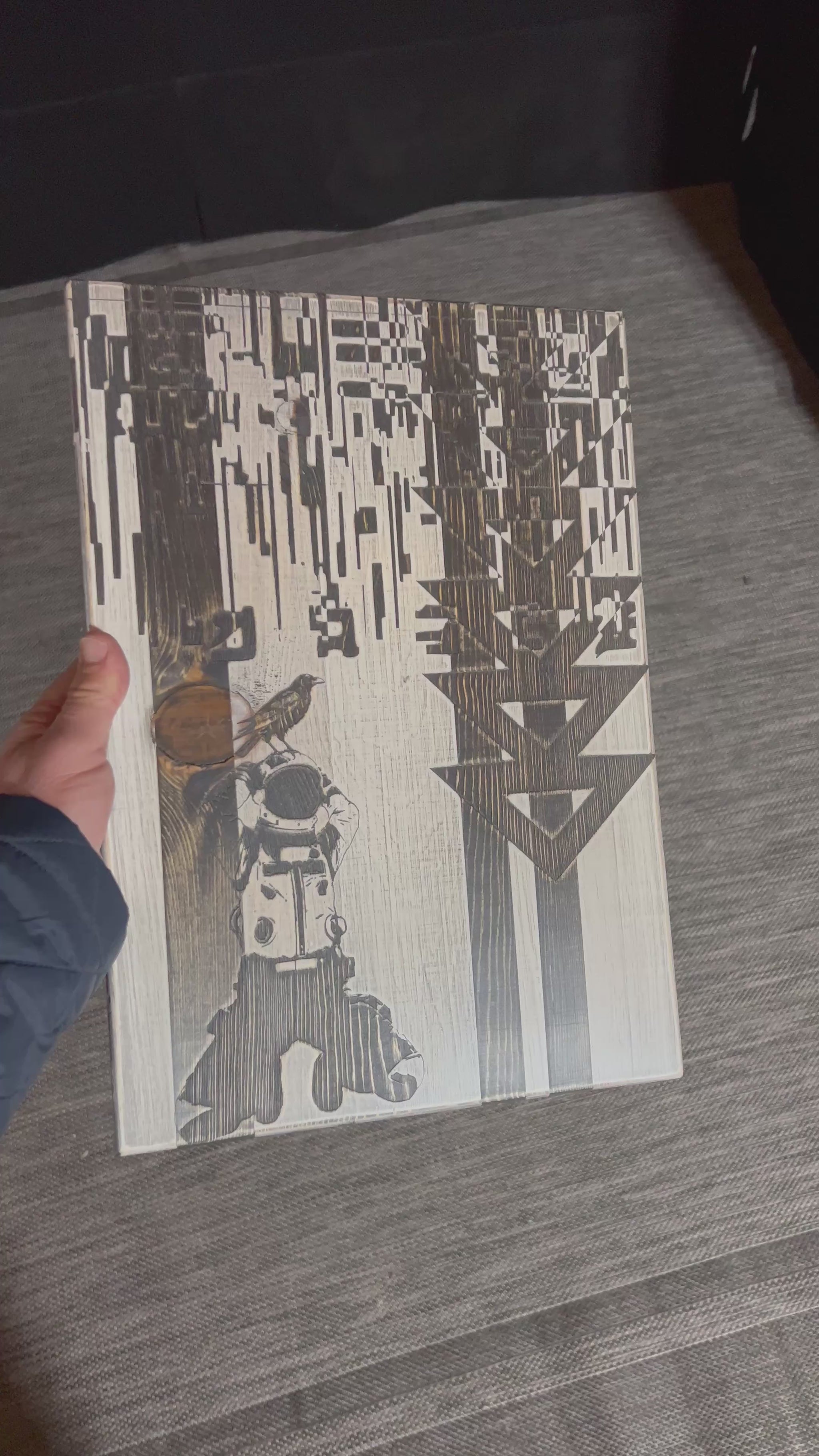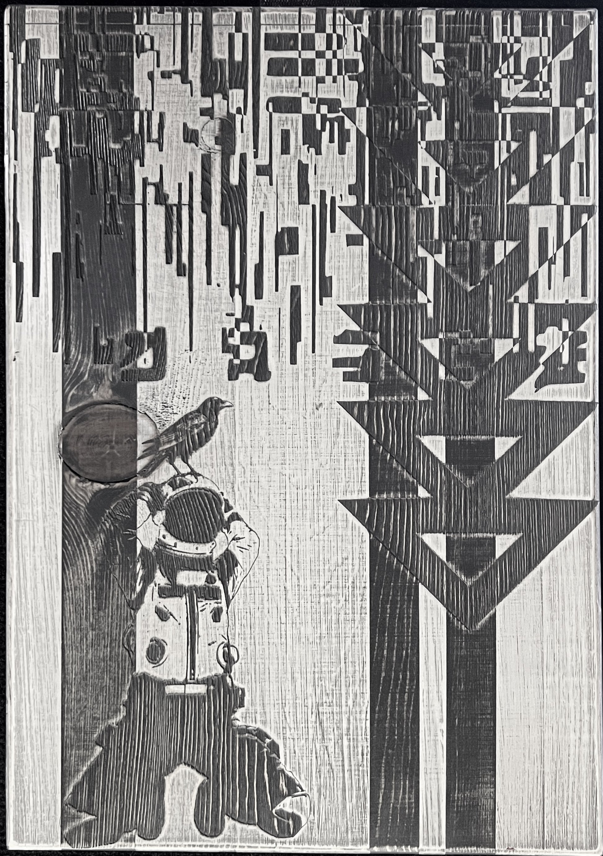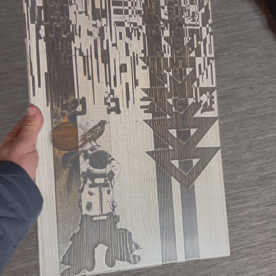 Original artwork consisting of abstracted characters collaged on wood, painted, sanded, etched, stained, and sanded to 2000 grit. Work is created on 3/4" board and is meant to be displayed unframed. It can hang from the installed saw hook or leaned. Titled and signed on back by hand. Piece is 11.25” wide by 16” tall.