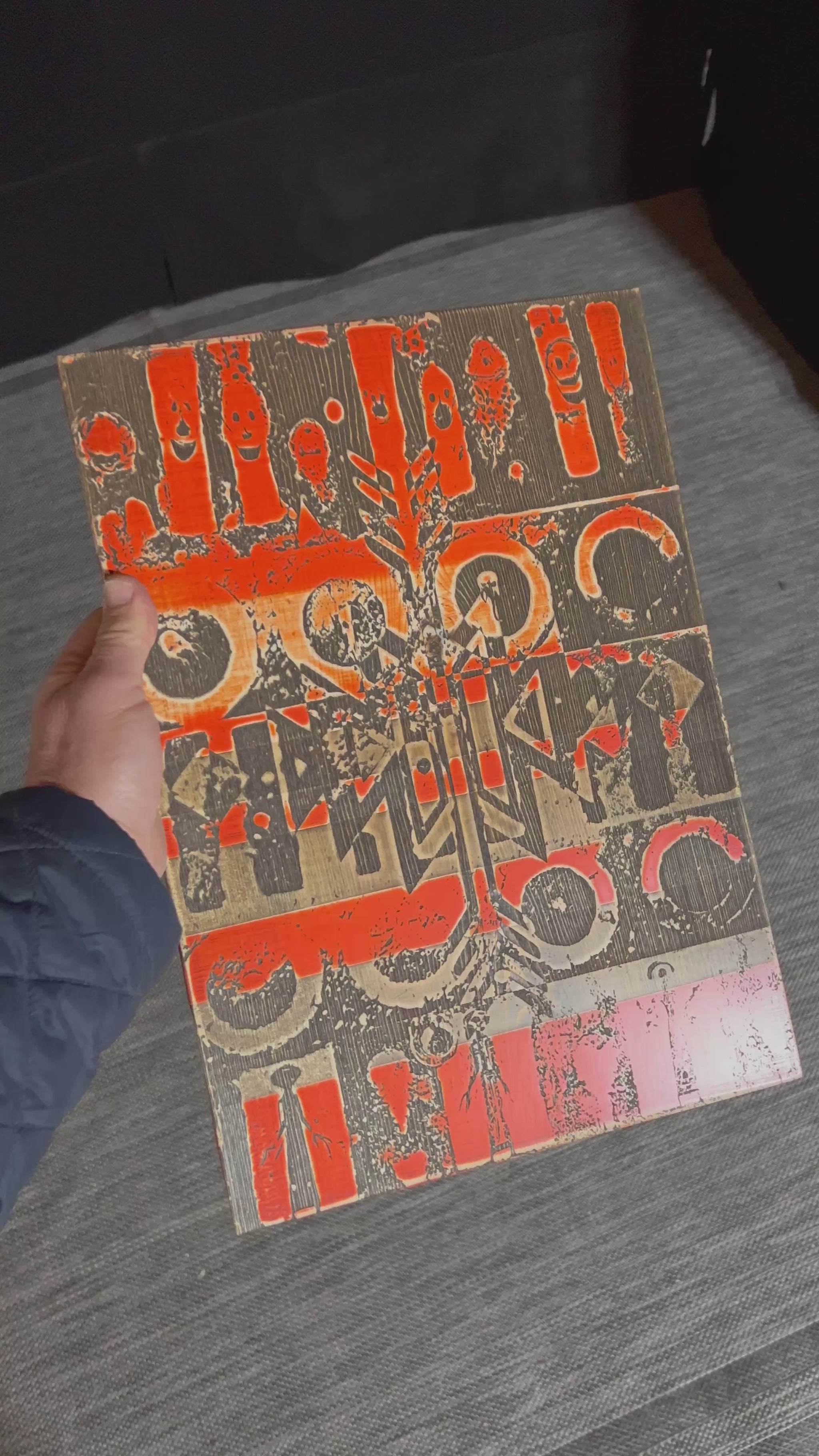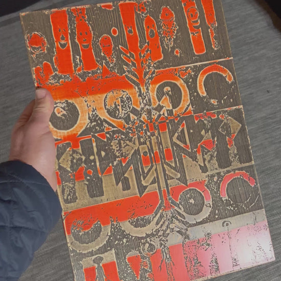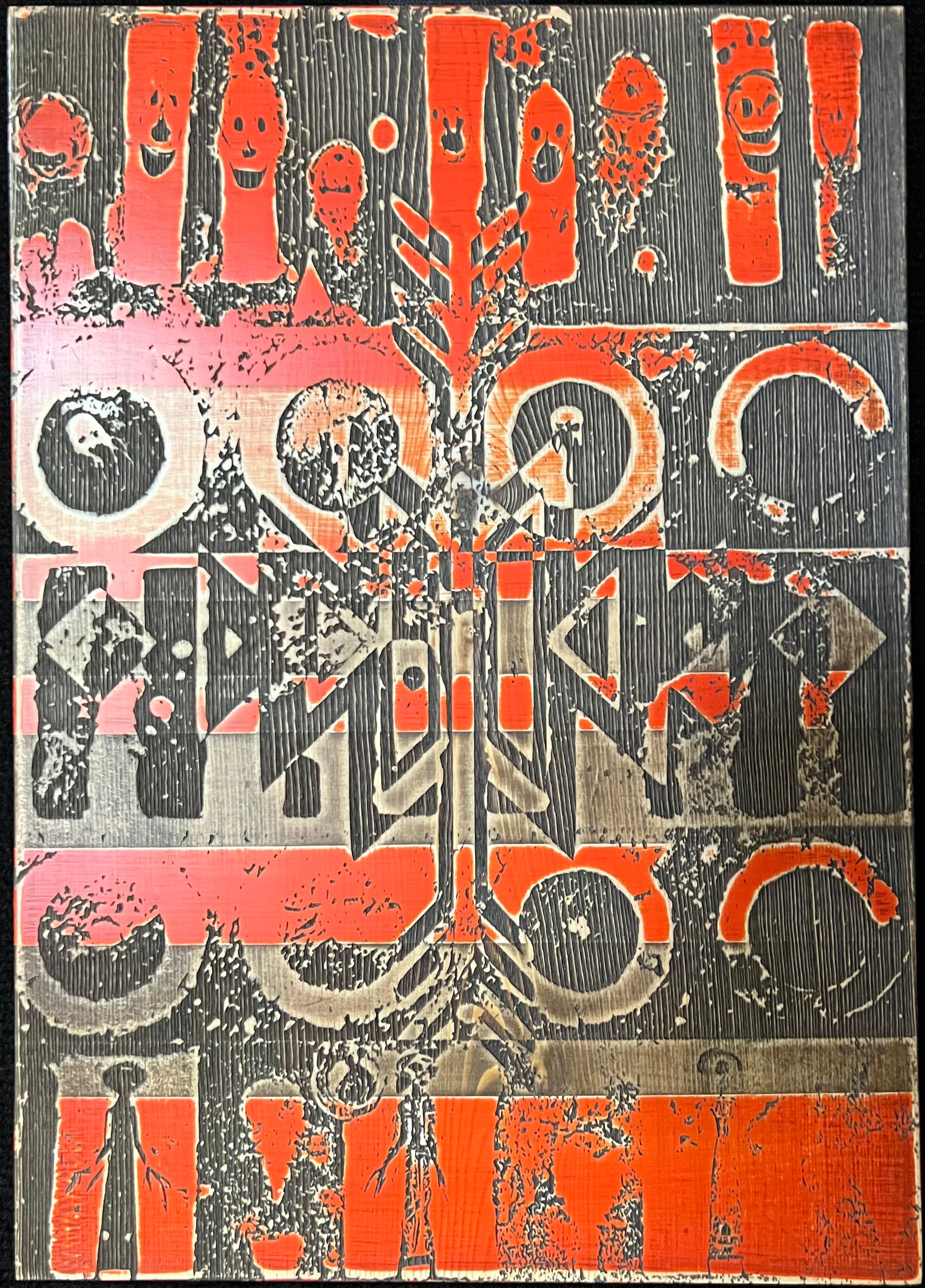 Original artwork consisting of abstracted characters collaged on wood, painted, sanded, etched, stained, and sanded to 2000 grit. Work is created on 3/4" board and is meant to be displayed unframed. It can hang from the installed saw hook or leaned. Titled and signed on back by hand. Piece is 11.25” wide by 16” tall.