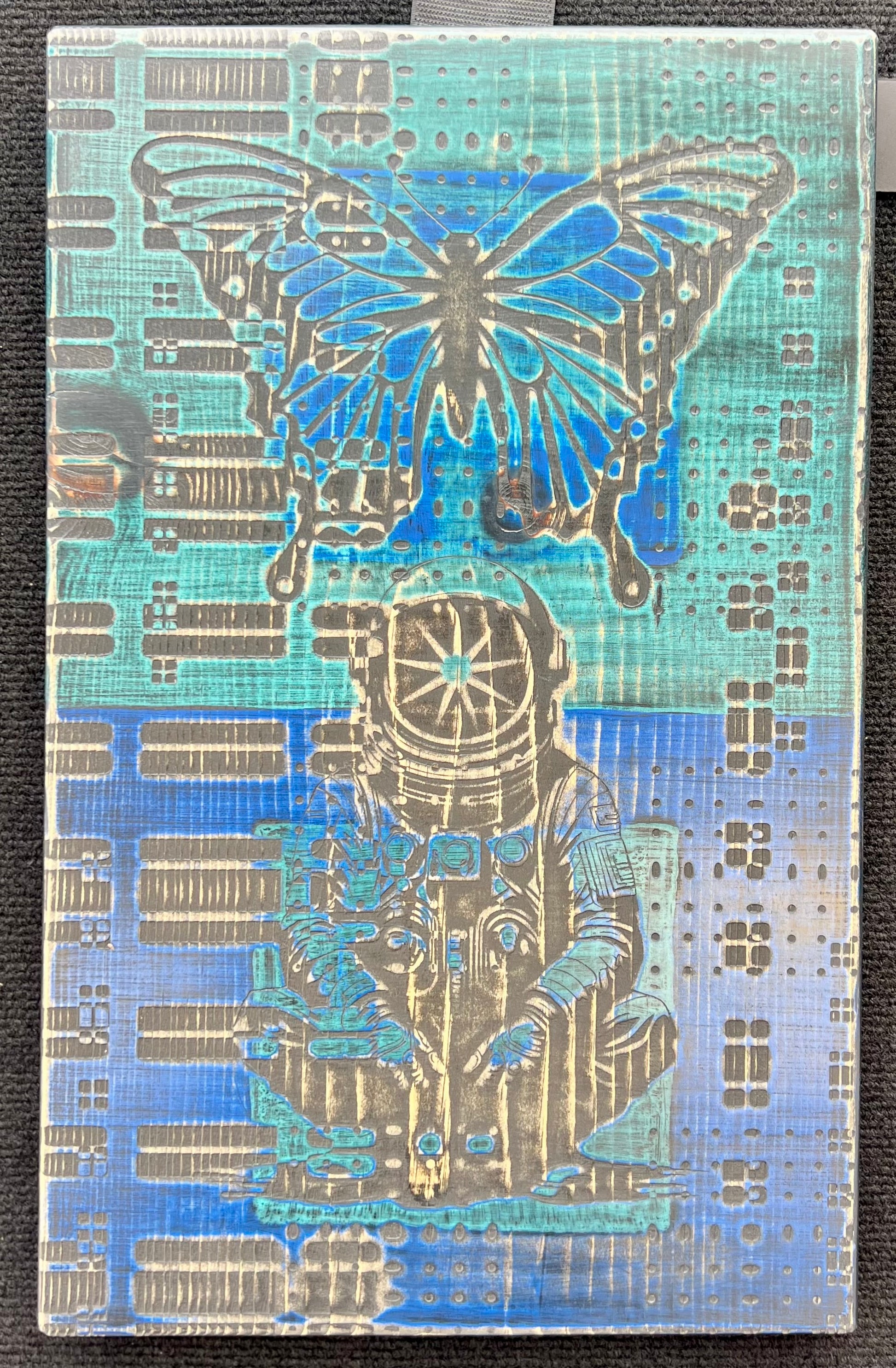 Original artwork consisting of abstracted characters collaged on wood, painted, sanded, etched, stained, and sanded to 2000 grit. Work is created on 3/4" board and is meant to be displayed unframed. It can hang from the installed saw hook or leaned. Titled and signed on back by hand. Piece is 11.25” wide by 18” tall.
