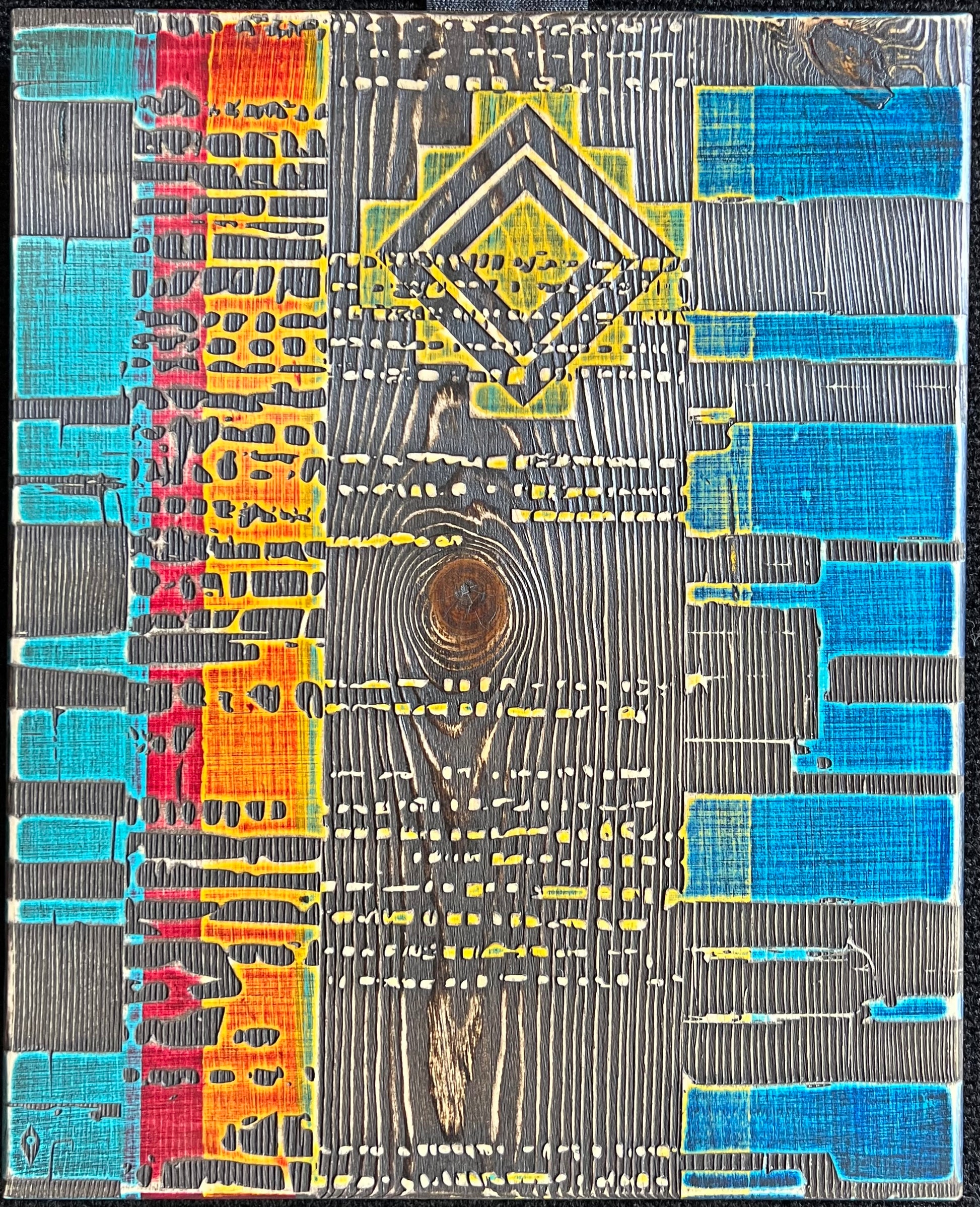 Original artwork consisting of abstracted characters collaged on wood, painted, sanded, etched, stained, and sanded to 2000 grit. Work is created on 3/4" board and is meant to be displayed unframed. It can hang from the installed saw hook or leaned. Titled and signed on back by hand. Piece is 11.25” wide by 14” tall.