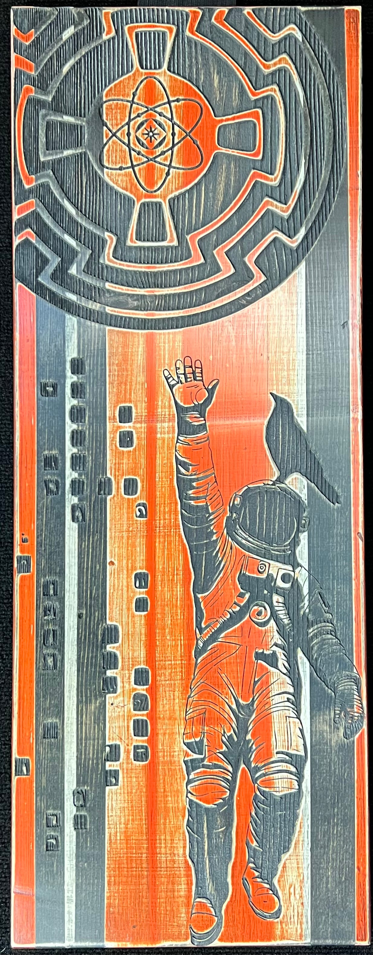 Original artwork consisting of abstracted characters collaged on wood, painted, sanded, etched, stained, and sanded to 2000 grit. Work is created on 3/4" board and is meant to be displayed unframed. It can hang from the installed saw hook or leaned. Titled and signed on back by hand. Piece is 11.25” wide by 30” tall.