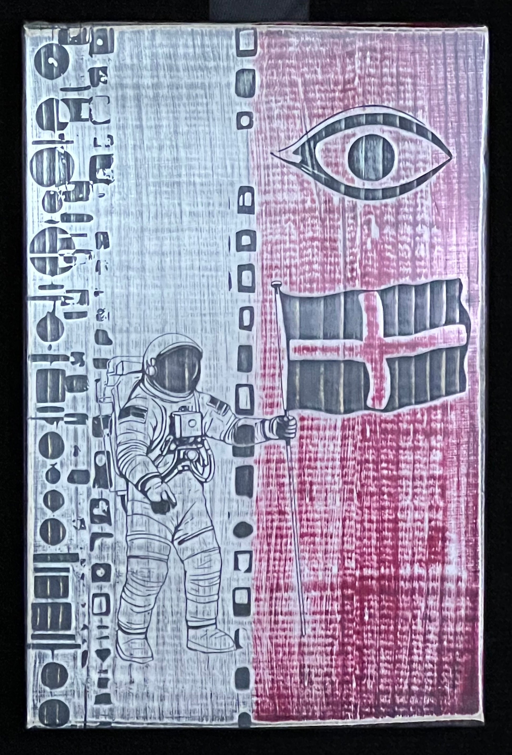 Original artwork consisting of abstracted characters collaged on wood, painted, sanded, etched, stained, and sanded to 2000 grit. Work is created on 3/4" board and is meant to be displayed unframed. It can hang from the installed saw hook or leaned. Titled and signed on back by hand. Piece is 9” wide by 14” tall.