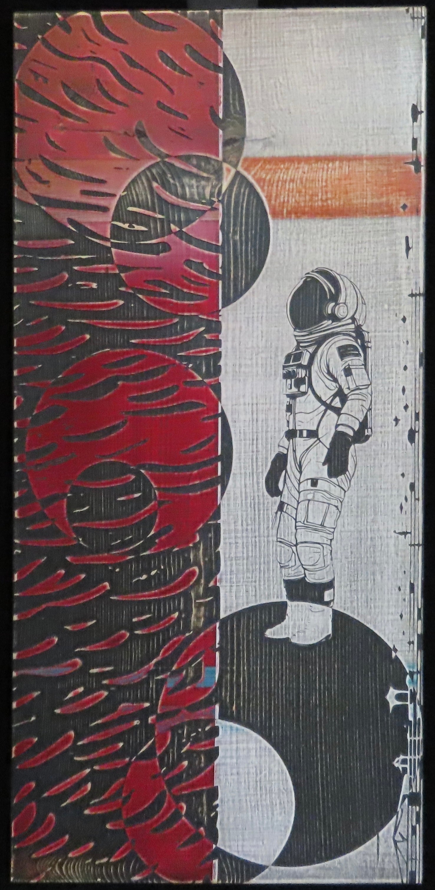 Original artwork consisting of abstracted characters collaged on wood, painted, sanded, etched, stained, and sanded to 2000 grit. Work is created on 3/4" board and is meant to be displayed unframed. It can hang from the installed saw hook or leaned. Titled and signed on back by hand. Piece is 11.25” wide by 24” tall.