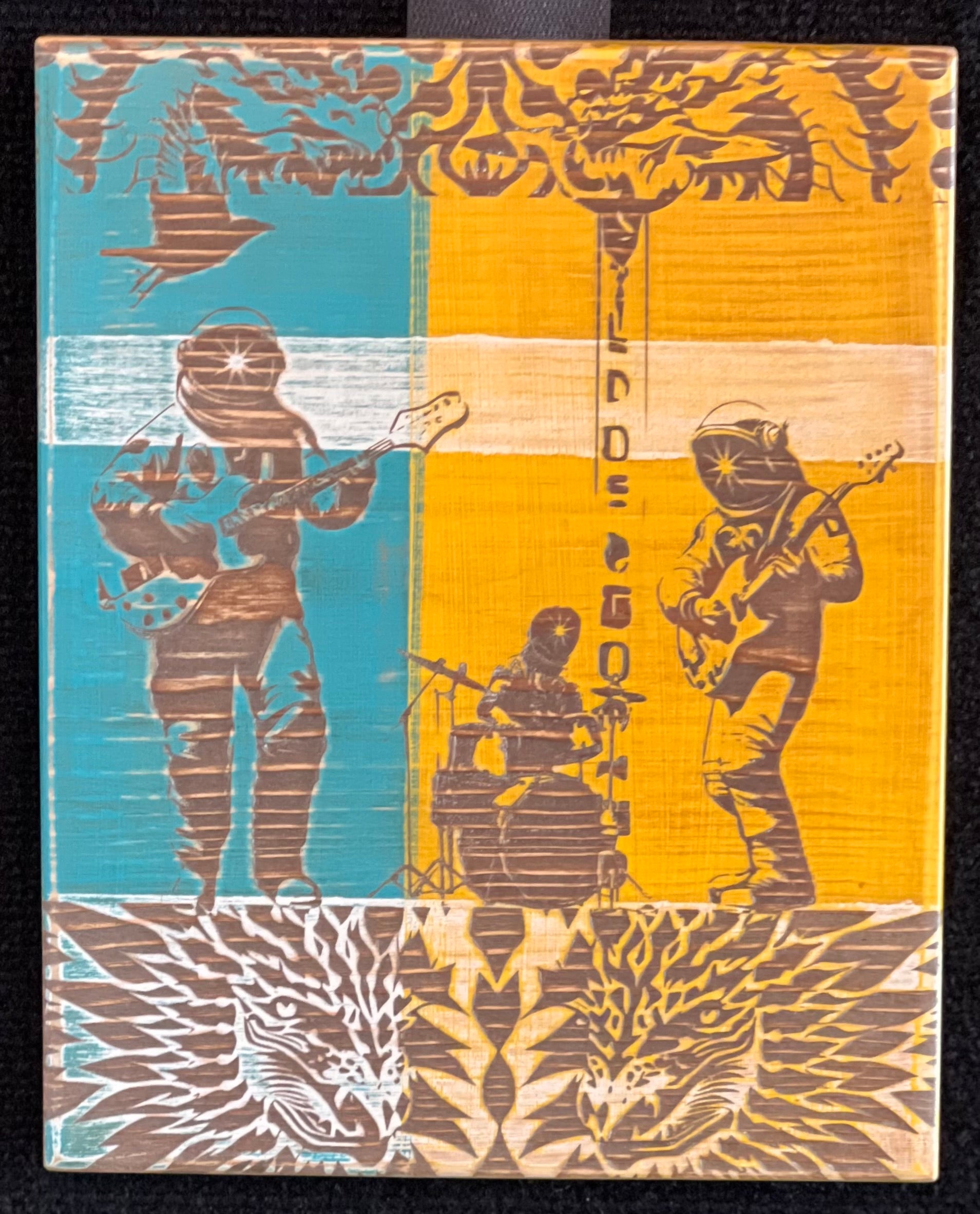 Original artwork consisting of abstracted characters collaged on wood, painted, sanded, etched, stained, and sanded to 2000 grit. Work is created on 3/4" board and is meant to be displayed unframed. It can hang from the installed saw hook or leaned. Titled and signed on back by hand. Piece is 9” wide by 11.5” tall.