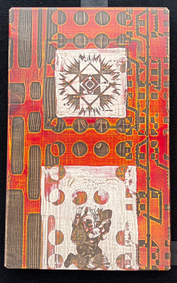 Original artwork consisting of abstracted characters collaged on wood, painted, sanded, etched, stained, and sanded to 2000 grit. Work is created on 3/4" board and is meant to be displayed unframed. It can hang from the installed saw hook or leaned. Titled and signed on back by hand. Piece is 11.25” wide by 18” tall.