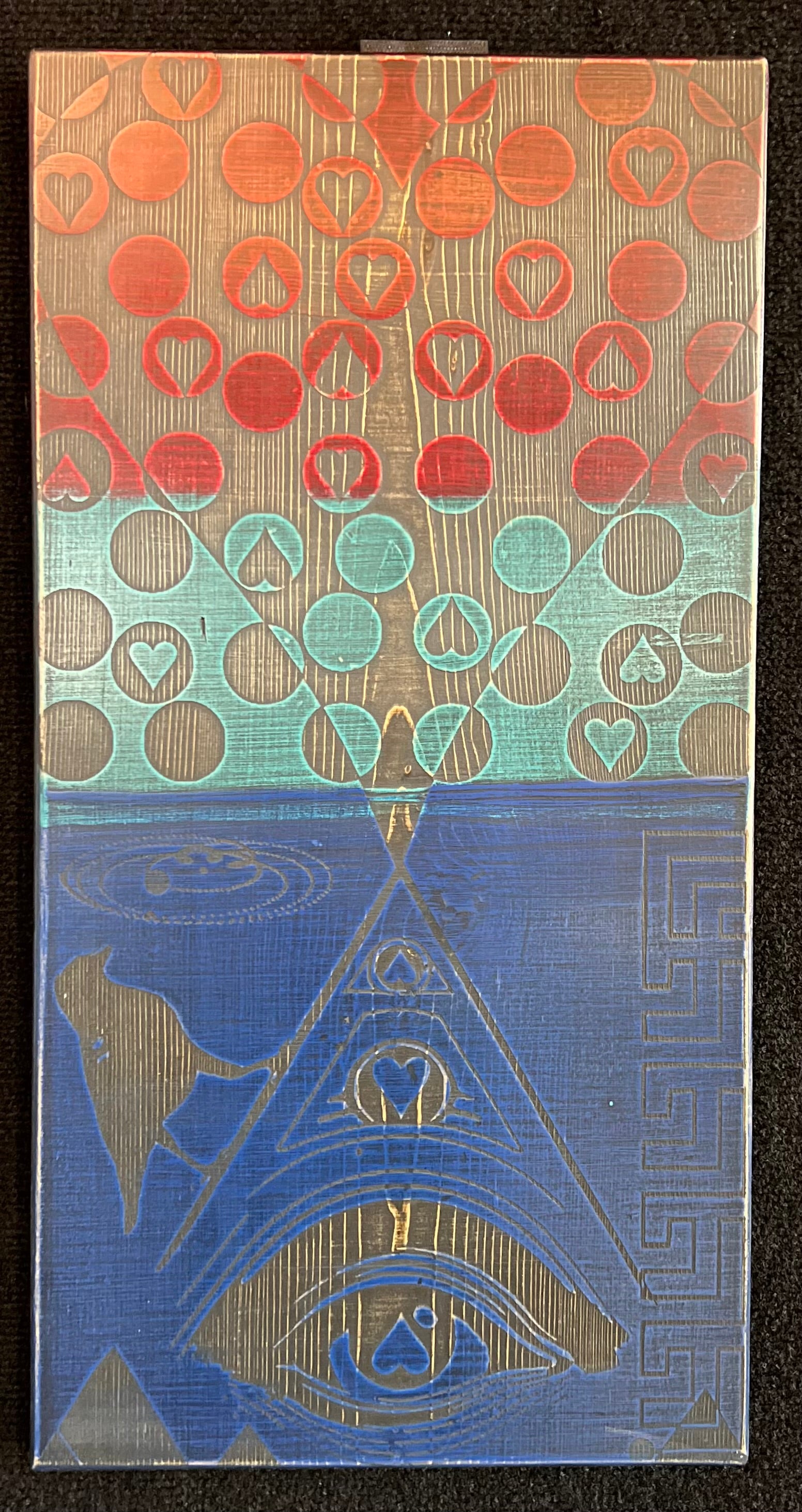Original artwork consisting of abstracted characters collaged on wood, painted, sanded, etched, stained, and sanded to 2000 grit. Work is created on 3/4" board and is meant to be displayed unframed. It can hang from the installed saw hook or leaned. Titled and signed on back by hand. Piece is 11.25” wide by 22” tall.