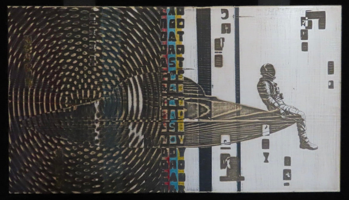 Original artwork consisting of abstracted characters collaged on wood, painted, sanded, etched, stained, and sanded to 2000 grit. Work is created on 3/4" board and is meant to be displayed unframed. It can hang from the installed saw hook or leaned. Titled and signed on back by hand. Piece is 20” wide by 11.25” tall.