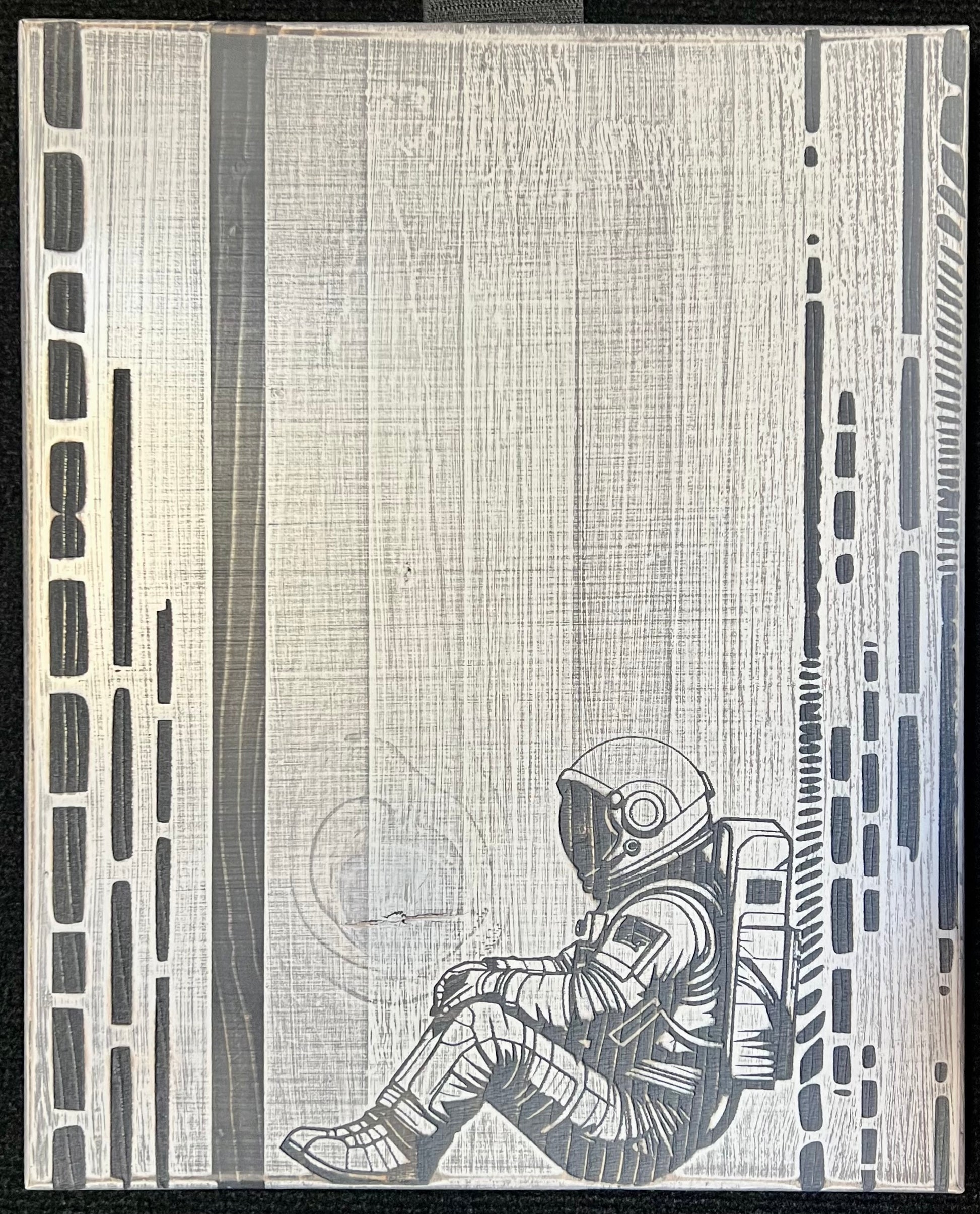 Original artwork consisting of abstracted characters collaged on wood, painted, sanded, etched, stained, and sanded to 2000 grit. Work is created on 3/4" board and is meant to be displayed unframed. It can hang from the installed saw hook or leaned. Titled and signed on back by hand. Piece is 11.25” wide by 14” tall.